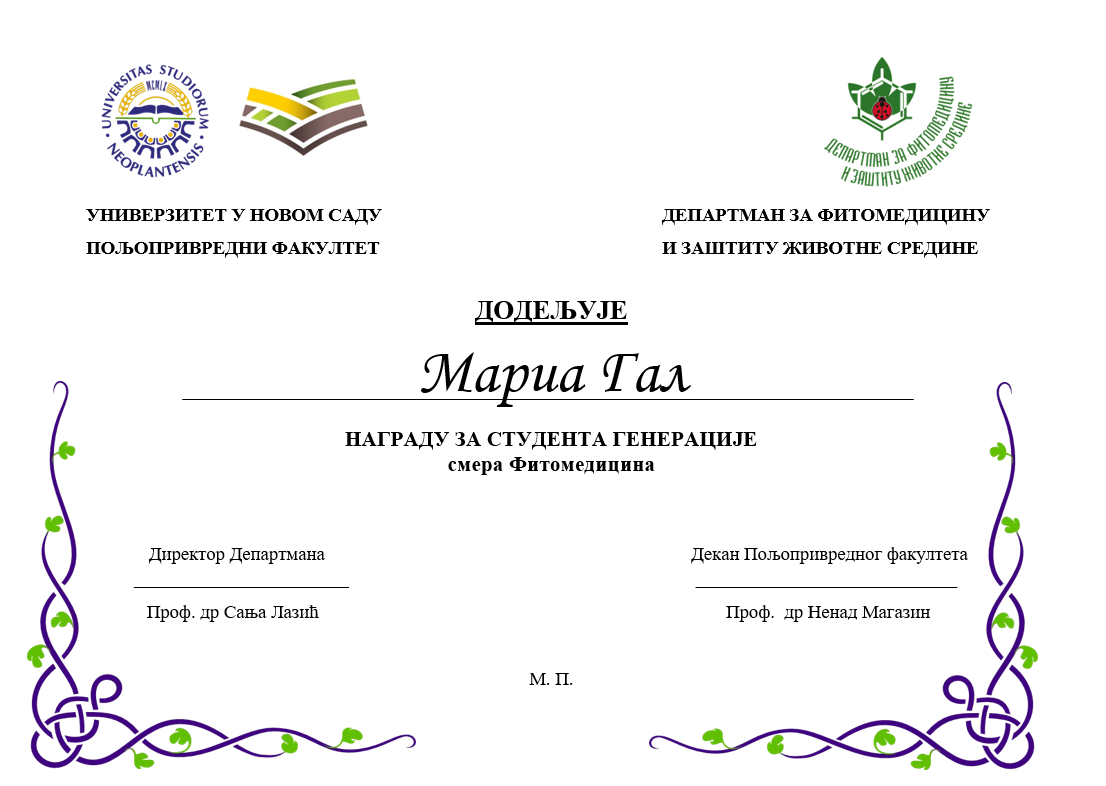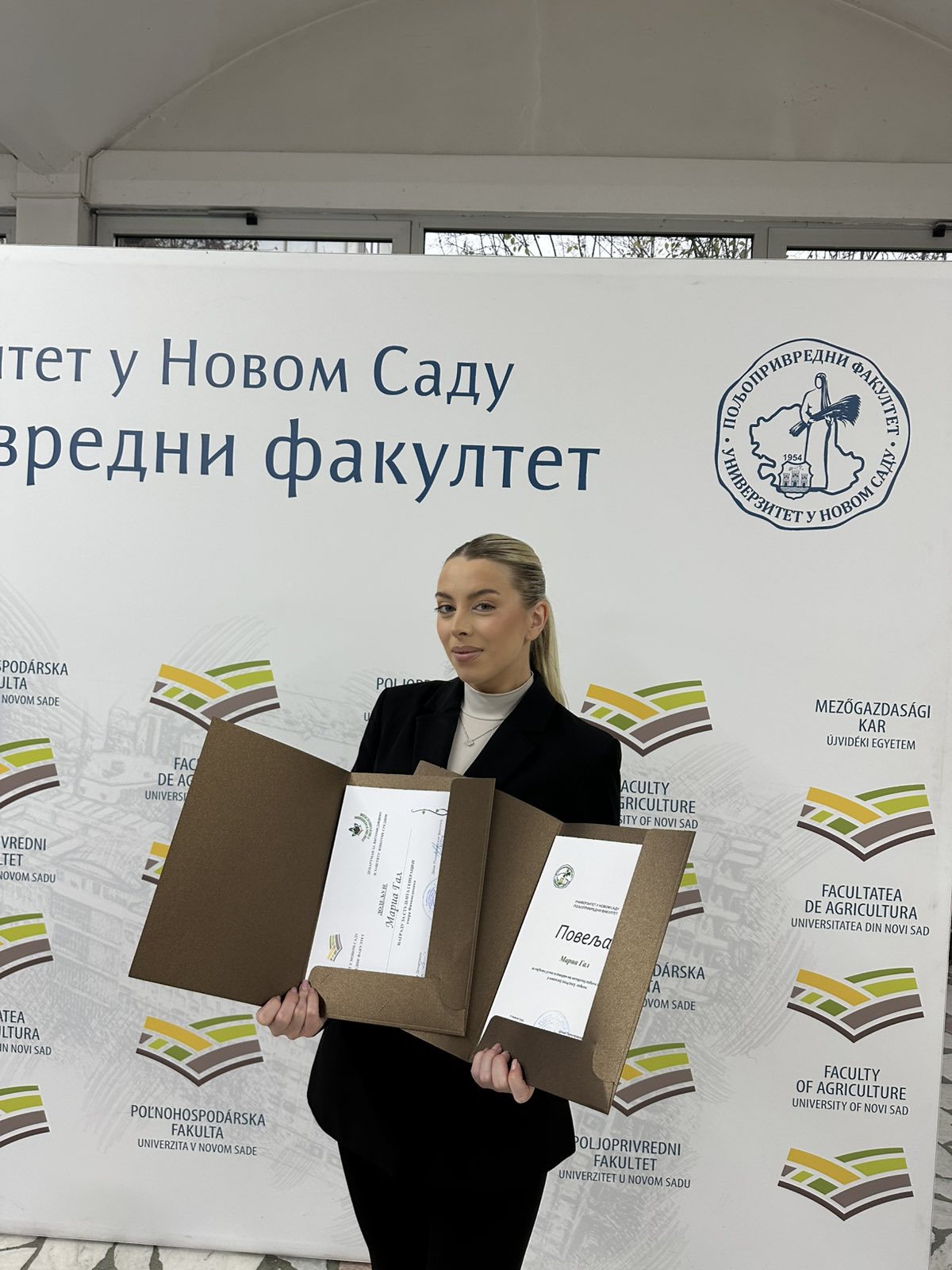 Az Újvidéki Egyetem Mezőgazdasági Kara 2025. november 21-én, pénteken ünnepséget tartott a kar napja alkalmából. Az eseményen kollégistánk Gáll Mária, generációja legkiemelkedőbb fitomedicina szakos hallgatójaként a Növényvédelmi Tanszék és a Mezőgazdasági Kar elismerő oklevelében részesült.