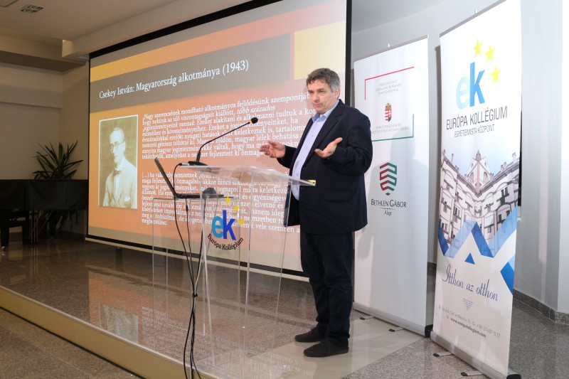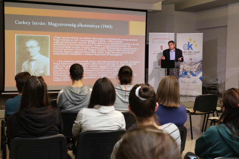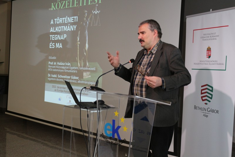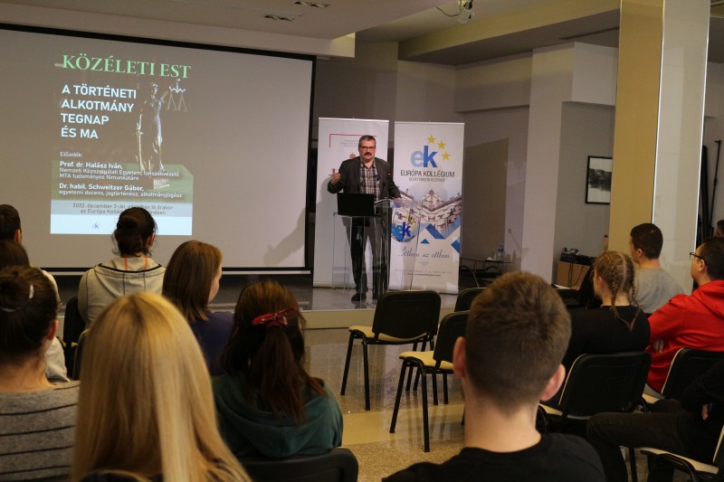 Pénteken, 2022. december 2-án a jogtudományok témakörében tartottak közéleti estet az Európa Kollégiumban. Dr. Halász Iván, az MTA tudományos főmunkatársa és a Nemzeti Közszolgálati Egyetem tanszékvezető professzora, valamint dr. habil. Schweitzer Gábor, egyetemi docens, jogtörténész és alkotmányjogász előadásában A történeti alkotmány tegnap és ma című előadást hallhatták a kollégisták.