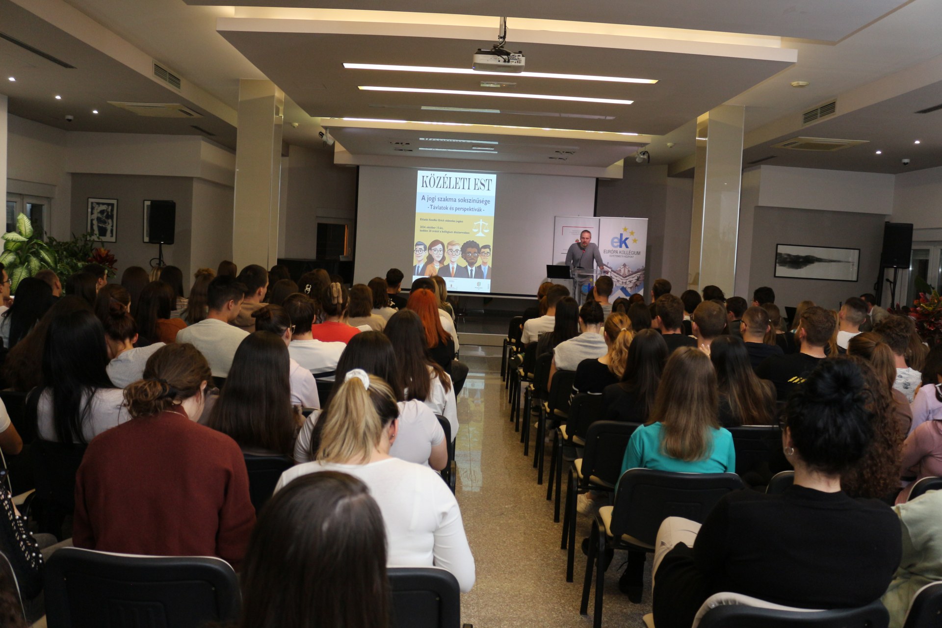 A rövid felvezetőben bemutatásra került Erich tevékeny részvétele a kollégium színtársulatában és a focicsapatában, ugyanis ő a kollégium első két tanévében volt bentlakó kollégistánk. Az előadásában pedig arról beszélt, hogy egykor hogyan kezdte el jogászként pályafutását, milyen sokszínű lehetőségek állnak rendelkezésre egy pályakezdő jogász esetében, az ezzel kapcsolatos személyes tapasztalatait is megosztva, illetve hogyan tudta összeegyeztetni a munkát és a családot, ugyanis nős és egy gyermek édesapja is. A távlatokat és perspektívákat illetően pedig a mesterséges intelligencia jogi szakmát érintő hatásáról is véleményt mondott. Az előadása végén kitért a kollégiumban eltöltött éveire is.