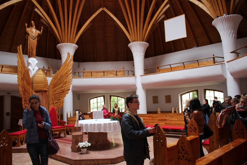 Még fel sem ocsúdva belőle már a Gyilkos tónál találtuk magunkat. Az elfogyasztott lángosok és miccsek után volt aki levetkőzte gátlásait és lábbelijét és megtapasztalhatta mennyire is hideg a tó vize, amíg a többiek beérték a látvánnyal és a kényelmes emésztéssel. Az aznapi székely útvezetőnk Kovács Sanyi bácsi búcsúbeszéde mindenkit megrendített. Leírhatatlan és libabőrt kreáló volt a kihangosított hangja. Átjárta a buszt, a lelkünket. Miután továbbállt, még sokáig megmaradt a jókívánságai okozta harmónia a levegőben. Következő állomásunk Csíksomlyó volt, és a Makovecz Imre tervei alapján épült Millenniumi Templom. Utunk során számos monumentális templomot láthattunk, azonban ez lebilincselő volt.
