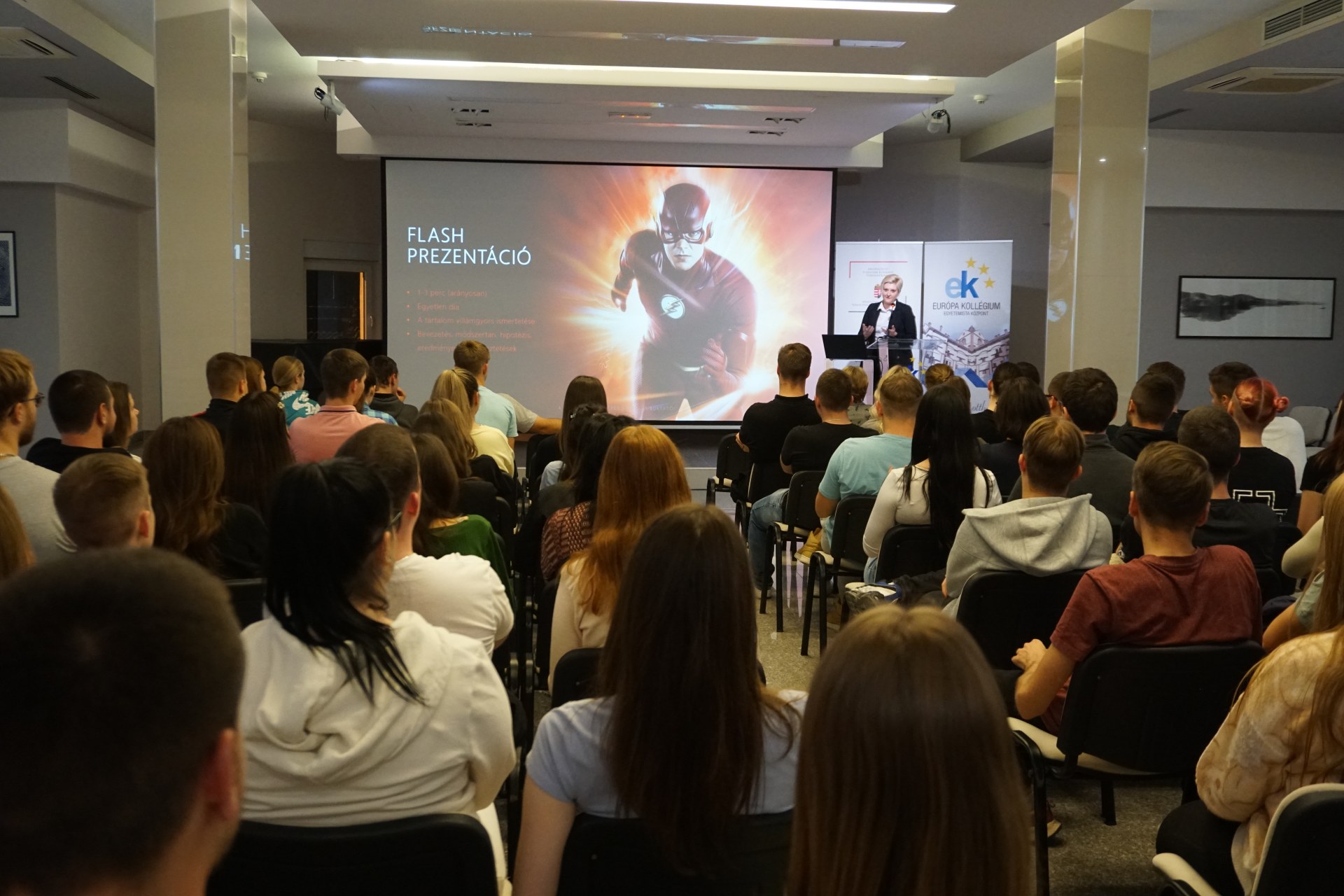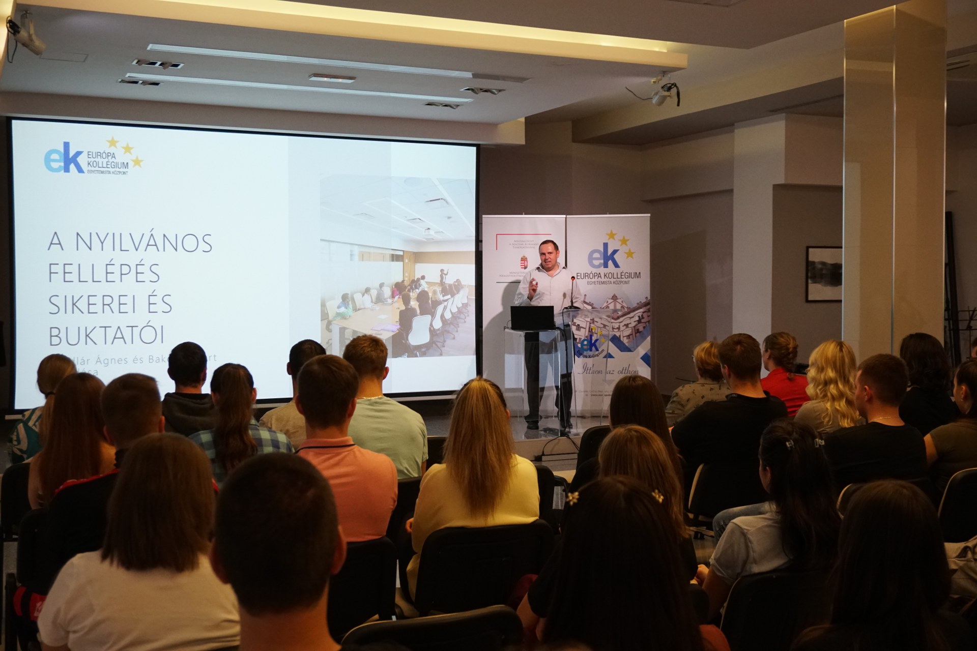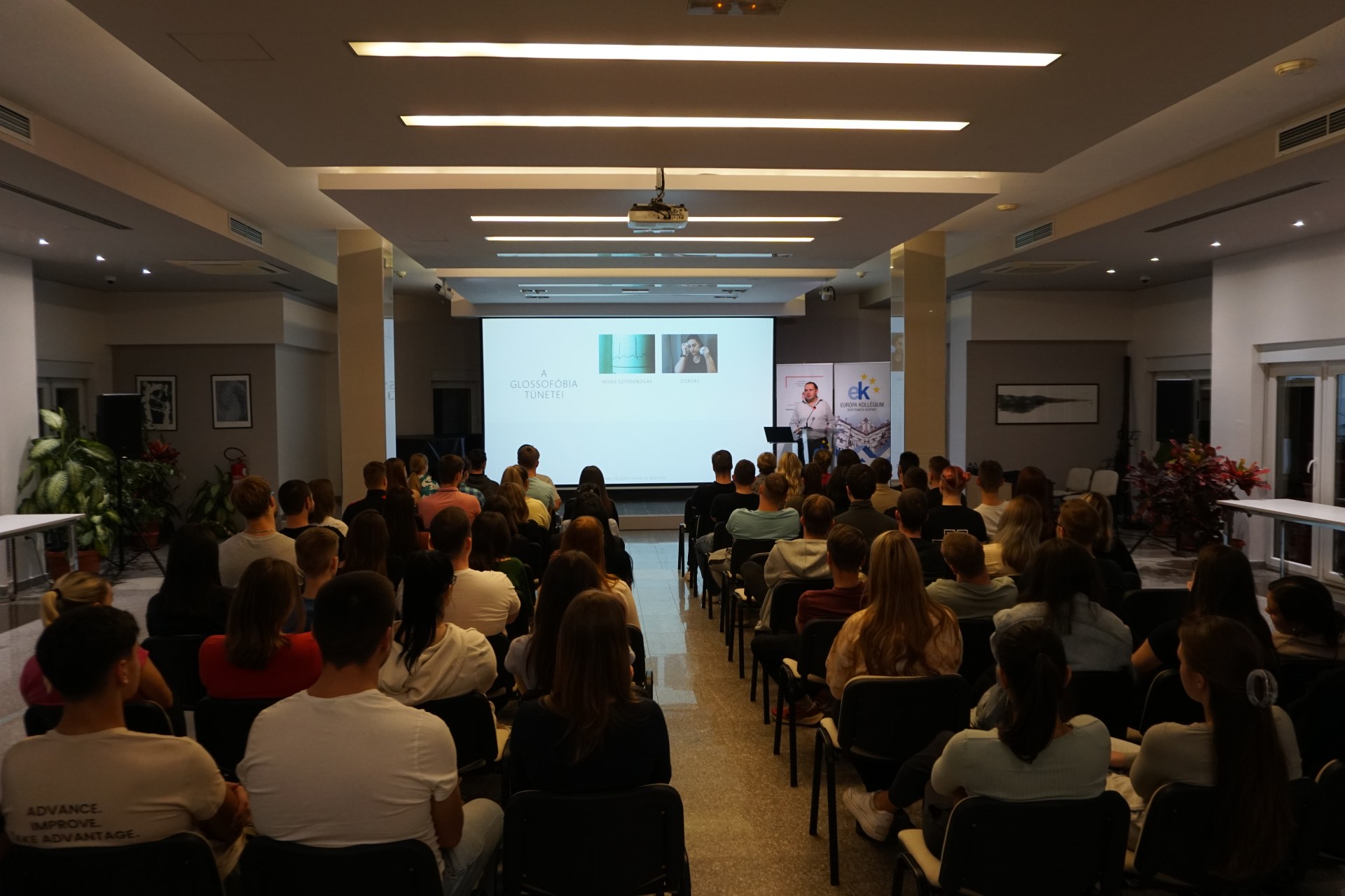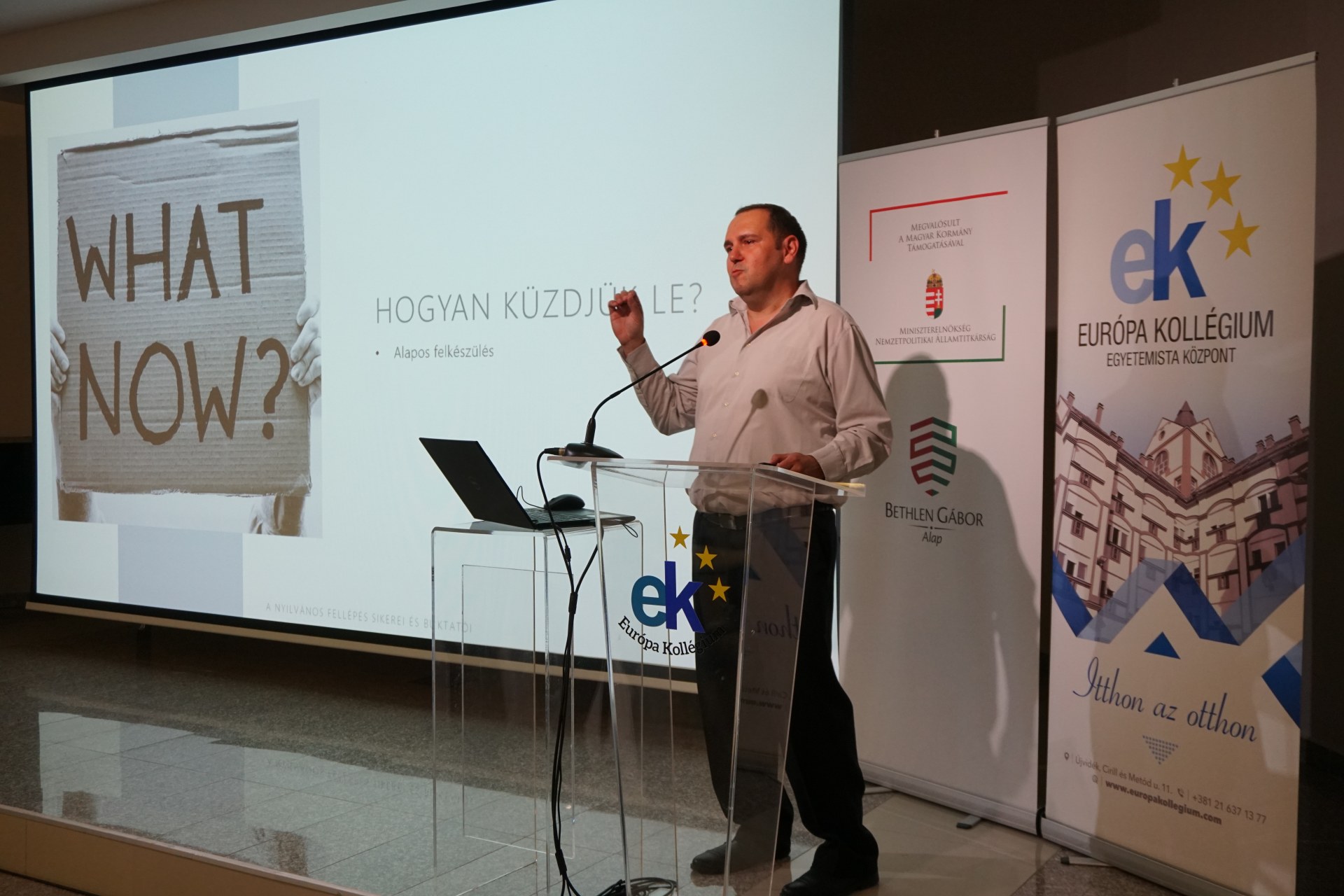 A közéleti est első felében Róbert nevelőtanár többek között ismertette, hogyan kell felépülnie egy sikeres előadásnak, mennyit és hogyan érdemes készülni a fellépésre, figyelembe véve a prezentáció formai tulajdonságait. Felhívta a figyelmet arra, hogy a kollégisták fektessenek hangsúlyt a magyar szakkifejezések pontos használatára és ügyeljenek a helyesírásra.