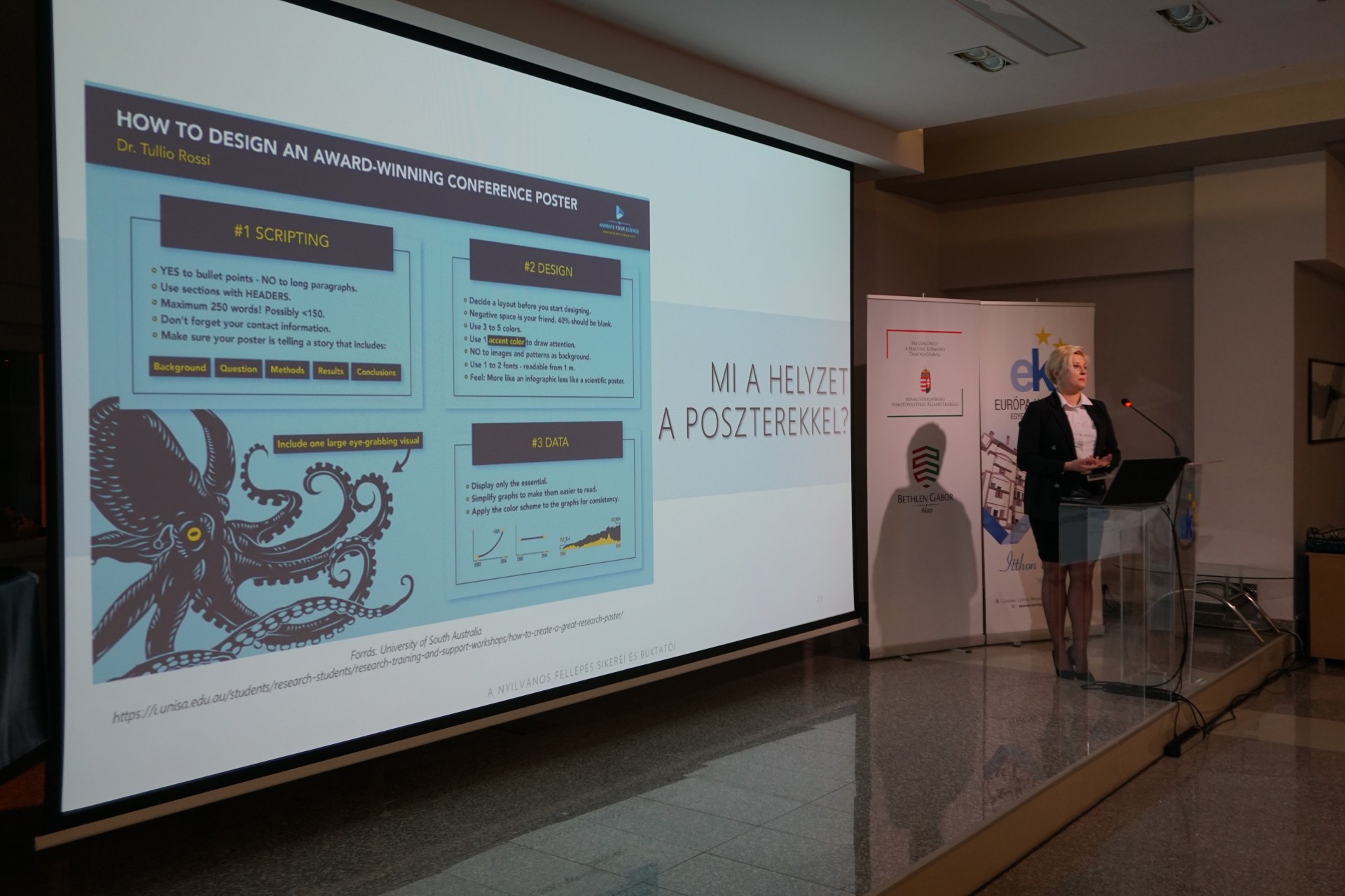 Az előadás folytatásában Ágnes nevelőtanárnő a konferenciák öltözködési kódexének betartásához adott hasznos tanácsokat a kollégistáknak. Előadása során beszélt a prezentáció kötelező formai kiegészítőiről, illetve említést tett a poszteres és a flash prezentációformákról is. Az előadás motivácós gyakorlattal fejeződött.