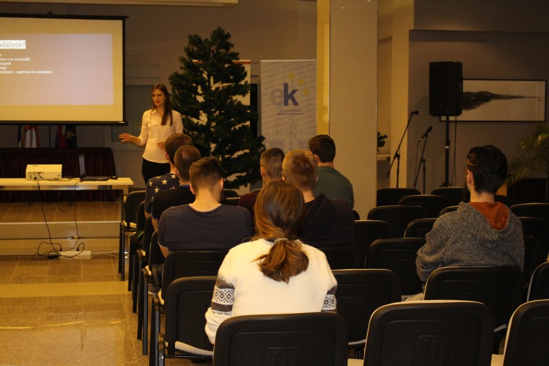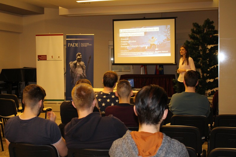 Majoros Brigitta, a Természettudományi-Matematikai Kar mester hallgatója tartott előadást a cserediák programokról a kollégista társainak a díszteremben.