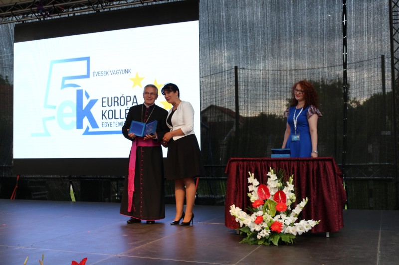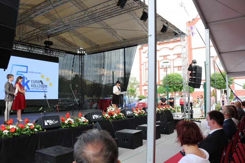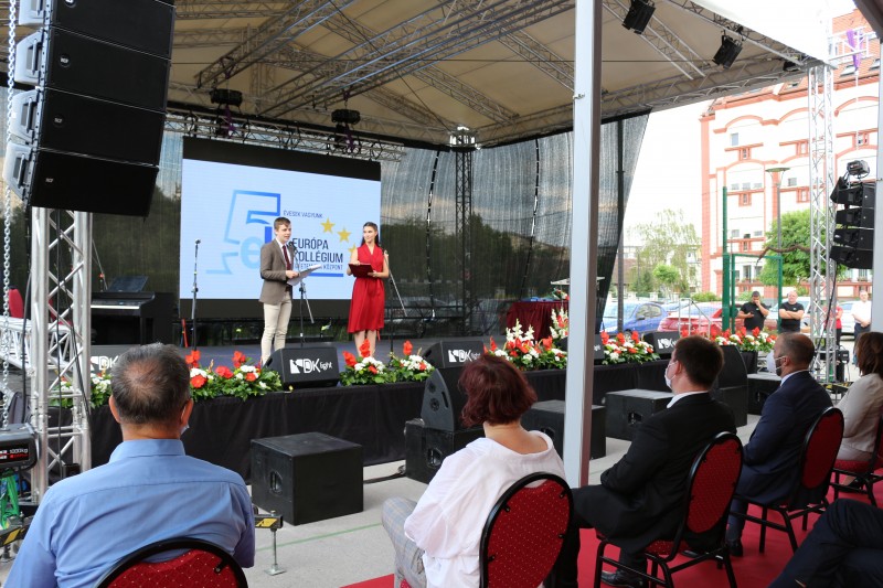 A szabadtéri ünnepi műsor elején Snejder-Sára Ildikó igazgató asszony köszöntötte az egybegyűlteket. Kiemelte, hogy külön öröm számára, hogy a nemzeti összetartozás évében került sor erre a jeles évfordulóra, amely a visszatekintés mellett a jövőbe tekintésre, a tervezésre is kötelez. Köszönetét fejezte ki mindazoknak, akik elhivatottságukkal lehetővé tették a kollégium létrejöttét és működtetését, és mindazoknak, akik munkájukkal megalapozták a kollégium által képviselt értékeket. Az elmúlt öt év eredményeit kiemelve, köszönetét fejezte ki Magyarország Kormánya Nemzetpolitikai Államtitkárságának „az egy nemzetben gondolkodásért, az anyagi, erkölcsi és szakmai támogatásért, és a biztató testvéri kézfogásokért.” Köszönetet mondott a Vajdasági Magyar Szövetségnek, a Magyar Nemzeti Tanácsnak, az Európa Alapítványnak és a Szabadkai Egyházmegyének is, hogy a nehézségekkel szembenézve létrehozták az Európa Kollégiumot, „hogy az tere és eszköze lehessen a vajdasági magyar közösség erősödésének, megmaradásának.” Snejder-Sára Ildikó emlékplakettel köszönte meg mindazoknak a munkáját, akiknek köszönhetően létrejöhetett és működhet az Európa Kollégium.