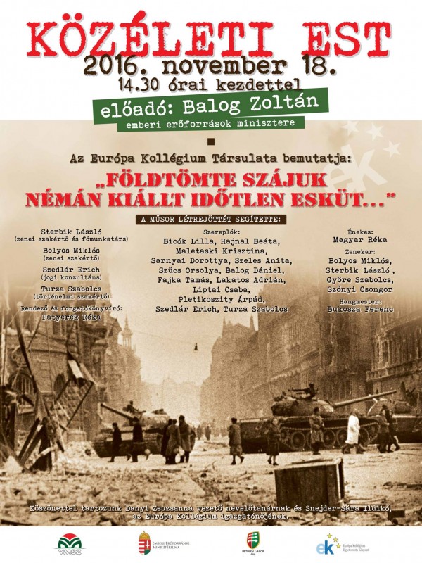 Mivel Balog Zoltán az 1956-os Emlékbizottság elnökeként a hatvan évvel ezelőtti eseményekről tartott előadást, az Európa Kollégium Társulata ismét előadta a nagysikerű „Földtömte szájuk némán kiált időtlen esküt” című előadását.