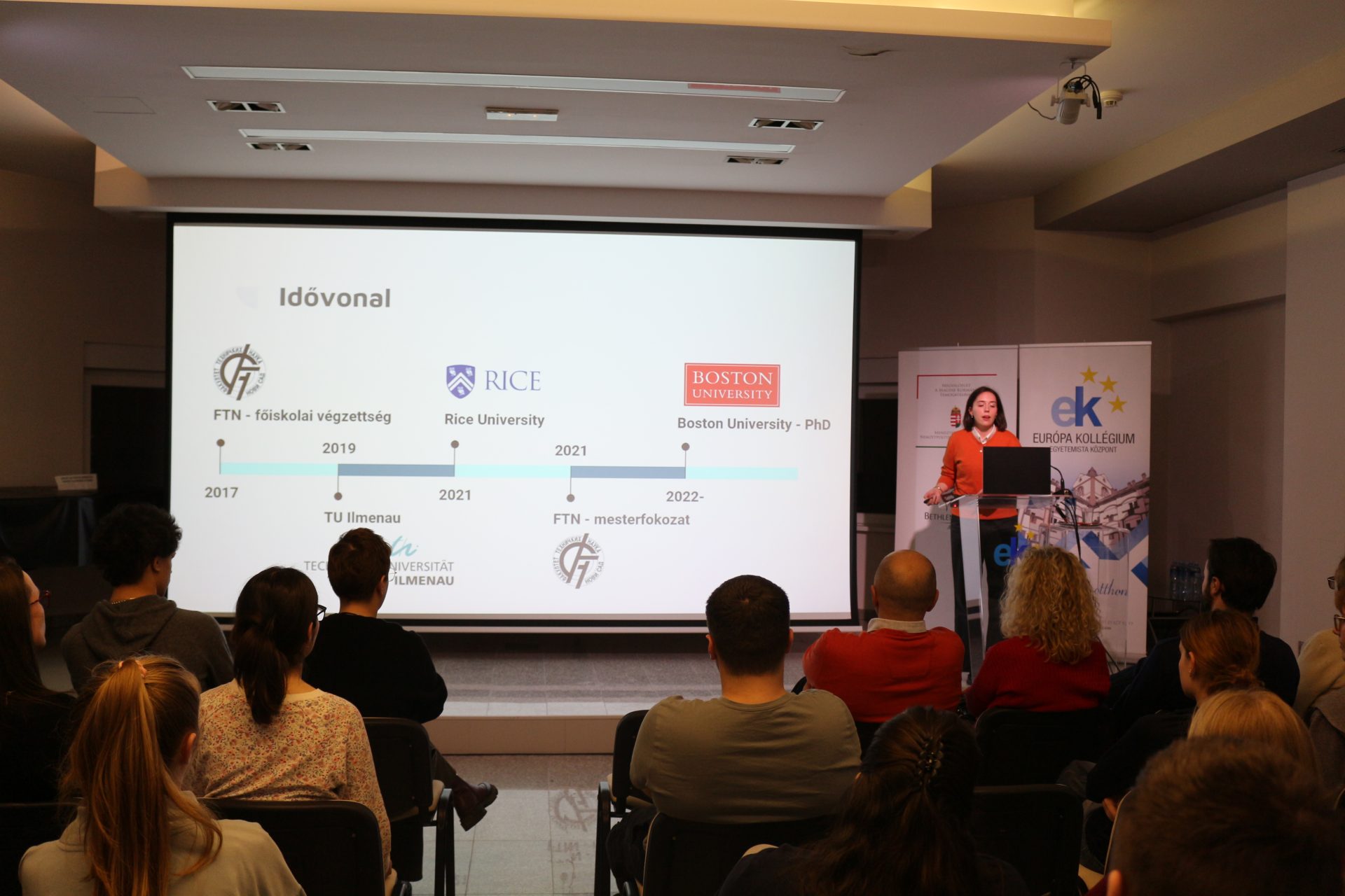 Beszámolt továbbá személyes tapasztalatairól is, hiszen többek között nemzetközi diákcsoport szervezőjeként, szakmai fejlesztési pályázati menedzserként, jelenleg egyetemi adminisztrációval foglalkozik. A közéleti est befejező részében kitért az egyetemi élet szépségeire és különböző lehetőségekre, mint amilyen a barátkozás és szórakozás.